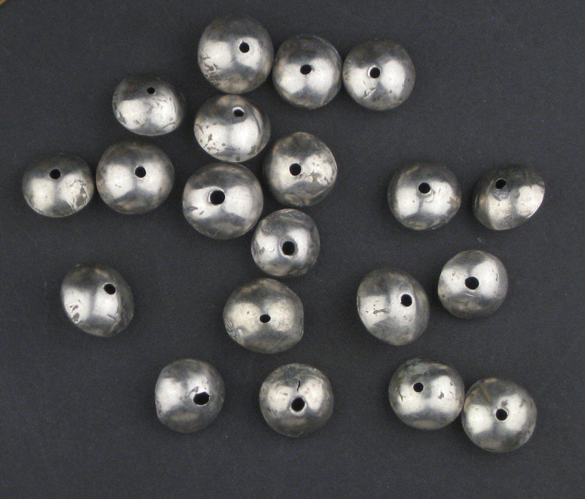 Here is a great set of silver color hollow bicone beads from Mali, West Africa. These versatile beads can be used as spacers and as accents for your beaded creations. Offered here is a set of 20 loose beads. Individual beads measure approximately 9mm wide by 14mm in diameter. Individual beads may show some wear such as small nicks due to age.