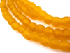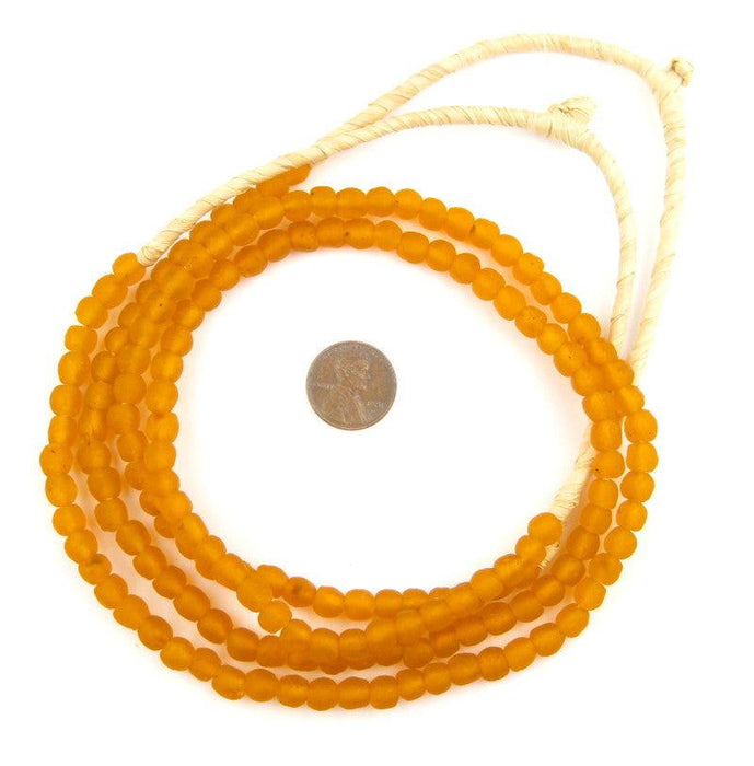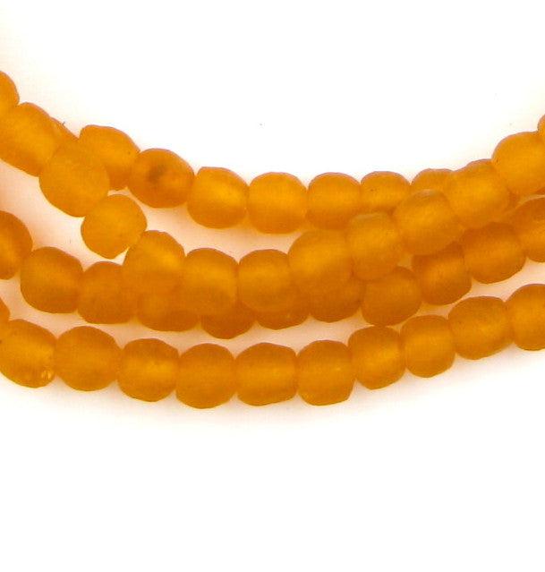 Take a look at this beautiful strand of orange recycled glass beads. These beads are unusually small, in a hard-to-find 7mm size. Great for bracelets and earrings! You will receive a 24" strand with approximately 80 beads. Recycled glass beads are a type of indigenously produced African bead from Ghana West Africa. These beautiful recycled beads are made using an old method that has been used for centuries. The glass itself is derived from a variety of recycled sources including old beverage and medicine bottles. The procedure for making the beads consists of a number of steps whereby powdered glass is poured into molds of clay and baked in a specialized oven. These beads are produced in large part by the Krobo tribe and are environmentally friendly.