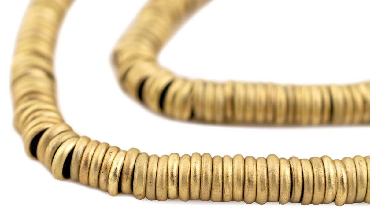 Take a closer look at this great strand of Matte Brass Heishi Beads. These metal beads are super useful and can easily be used as spacers and accent beads in your jewelry design projects. Each bead measures about 1.3 x 6mm with a generous hole size of roughly 4mm. Perfect for thicker cords. You will receive on full strand measuring approximately 16" in length. Add this staple bead style to your design toolkit today.