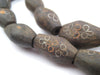 Brought to you from a village not far from Western Mali, these beautiful ebony wood beads are uniquely inlaid with a traditional tribal pattern using silver and copper. Inlaid ebony beads can be hard to come by, particularly in this unique bicone shape. Each strand includes approximately 32 high-quality, handmade beads, each measuring approximately 26mm wide by 15mm in diameter. Holes measure approximately 4-5mm, and each strand is about 36 inches long. These beads could make a great addition to your beaded creation, or can simply be worn as is.