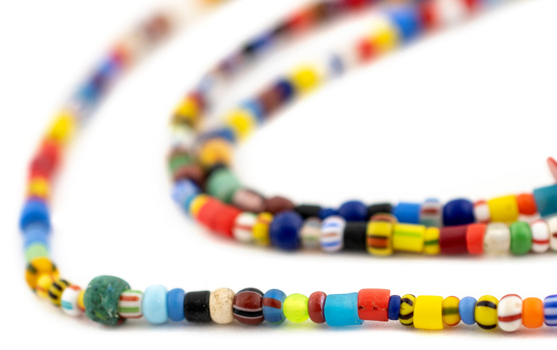Christmas beads comprise of a special blend of choice beads created in former Czechoslovakia for use in Africa. Also known as "African love beads," each strand is 100% unique; no two strands are alike. Please take note: these beads are authentic vintage production, unlike modern replicas which are widely available in the market today. These fun beads can either be used for your own beaded creations, or worn as is. Traditionally, multiple strands are worn at once. Available in a variety of sizes and styles. Multiple strands pictured. Each strand sold individually. This bead is being sold as a linear strand, not tied as a loop. May be used as waist beads but note that the strand is not finished with a clasp. Get yours today!