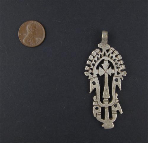 Designed in Ethiopia, this Coptic Cross pendant is intricately crafted, showcasing exquisite artistry and cultural significance. The pendant can be worn as-is, simply by running a chain through it. This artisanal cross is made with a white metal alloy. The design on the back of the cross is similar to what is shown on the front so these pendants are basically double-sided! Medium crosses measure APPROXIMATELY 1.5-2'' wide and 2.5-3'' in length. Each pendant is unique and may vary slightly from picture.