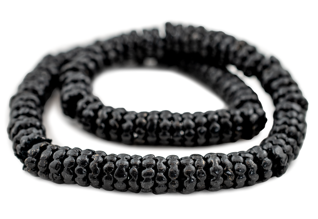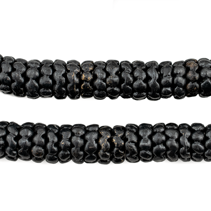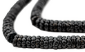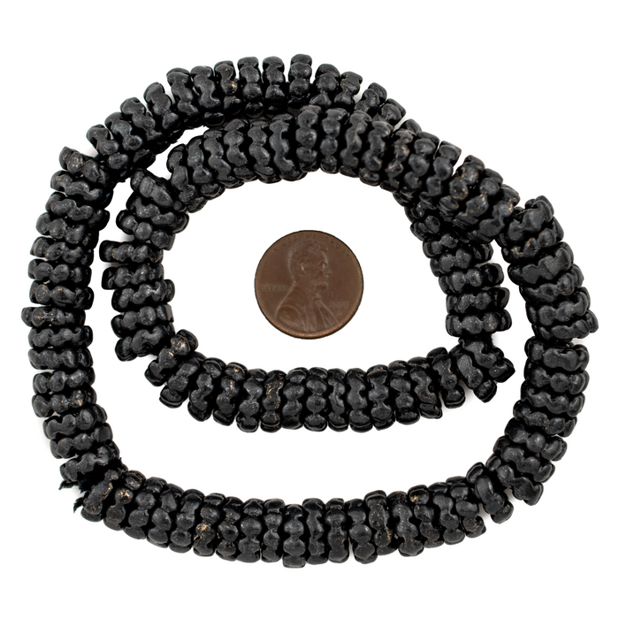 These black color brass beads are cast in a design reminiscent of Venetian Aja beads. Each bead measures approximately 3 x 11mm diameter with a hole size of 1mm. Strands measure approximately 15" in length. The quality of the workmanship becomes apparent when you hold these beads in your hand and feel how solid they are. These beads make for great spacers in beaded designs. Get yours today!