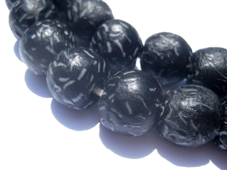 A beautiful strand of powder glass African beads, made by the people of Krobo Mountain (Ghana, West Africa), reproducing old Venetian FANCY trade beads. Made from bottles and other glass items that are turned into powder, then poured into molds in order to create nice looking round-shaped beads. Decorations on the beads are made with a paste made of colored glass powder and water, which is applied using a thin wooden stalk. They are cooked a second time to fix the decor. The beads are handmade.