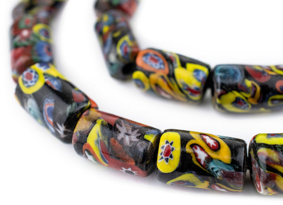 Admire this beautiful strand of glass millefiori beads. Look closely and you will see different colored flowers hand fused into each bead. Each bead measures approximately 18 x 8mm with a hole size of approximately 3-4mm. You will receive a full strand measuring approximately 24 inches.
