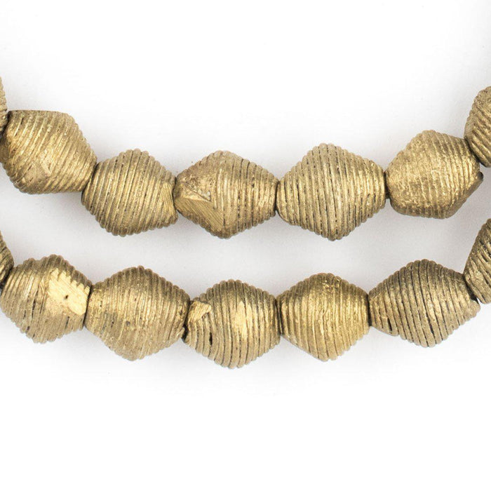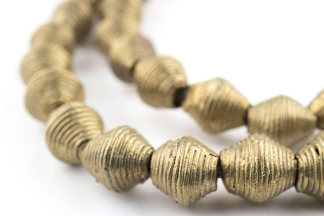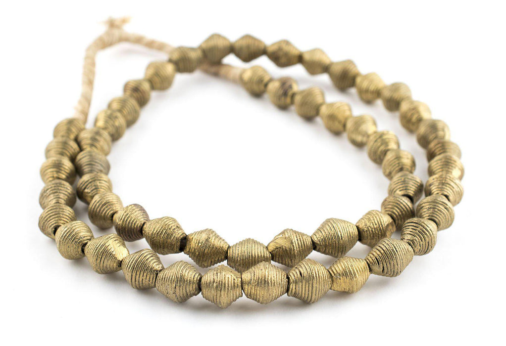 Take a look at these bicone-shaped Ghana Brass Trade Beads from Africa. Each bead is made individually through the "Lost Wax process" technique. This strand is about 26", with beads measuring approximately 11 x 10-11mm. Each strand may have 1-2 beads that are less than perfect and may vary slightly from strand pictured.