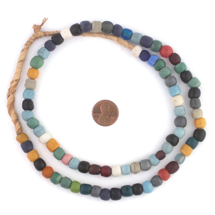 These beautiful recycled glass beads are handmade by artisans in the West African country of Ghana. Each bead is individually handcrafted through a traditional process passed down generation to generation. The steps involve crushing glass into tiny pieces, placing it in a mold, and then heating the crushed glass at high temperatures in a clay oven. Different types of glass are used including old cola bottles, broken tiles and windows, and other types of repurposed glass. The beads on this strand measure approximately 6-9 x 8-9mm with a hole size of approximately 2-3mm. Each strand measures about 28". Mixture of colors may vary slightly from photo. Get your strand today!