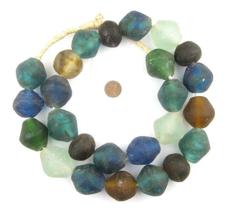 Take a look at this exceptionally large strand of jumbo-sized multicolor recycled glass beads. Large beads such as these are hard to find and even harder to find in good condition. The journey from Africa can sometimes be unkind to such large beads! These beads are sure to make an impression wherever they go. Use them as centerpieces for special jewelry, as adornments for interior design, or even as a wall hanging to decorate your favorite room. You will receive a 37" strand with approximately 25 beads. Recycled glass beads are a type of indigenously produced African bead from Ghana West Africa. These special beads are made using an old method that has been used for centuries. The glass itself is derived from a variety of recycled sources including old beverage and medicine bottles. The procedure for making the beads consists of a number of steps whereby powdered glass is poured into molds of clay and baked in a specialized oven. These beads are produced in large part by the Krobo tribe and are environmentally friendly. Non-USA buyers, please note that a heavy-weight surcharge may apply for this item. Please inquire in advance if you would like to pre-confirm this fee.