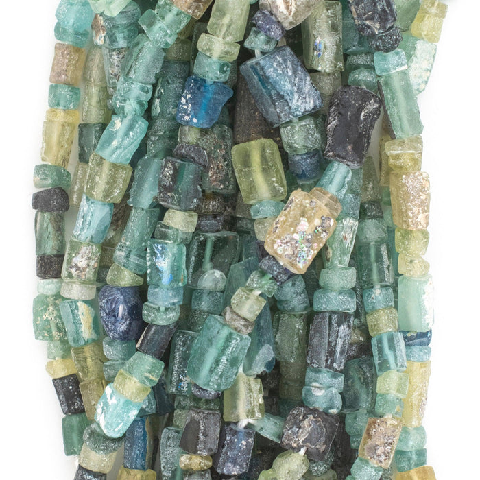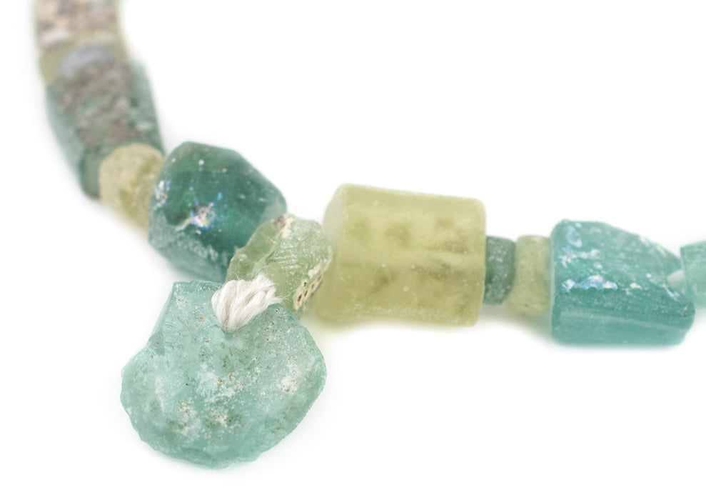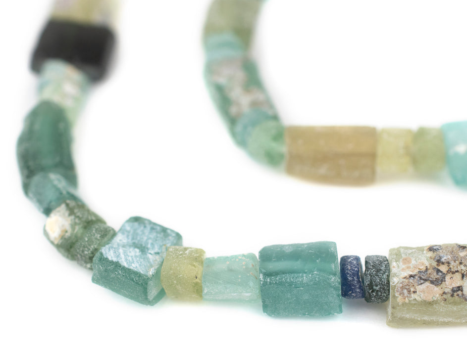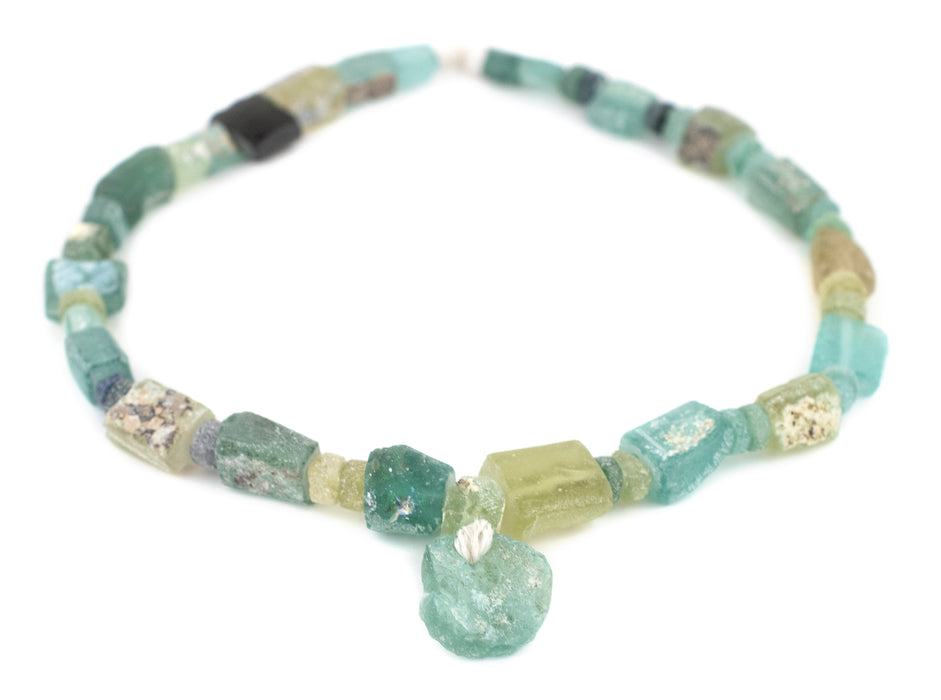 Admire this unique strand of beads made from ancient glass pieces found in the region along the historic silk road. Commonly referred to as Roman Glass, the material for these beads is derived from ancient cups, vases, and perfume containers that have sustained the travails of time. If you look carefully, you will see that these beads have a unique patina endowed by the mineral deposits where the glass lay buried. Each glass piece has been individually drilled and threaded to create a strand. No two strands are alike but you will receive a strand similar to that pictured. Each bead measures approximately 2-18 x 6-13mm with a hole size of approximately 2mm. You will receive a full strand measuring approximately 33". Note that while the material is said to be of old, possibly ancient origin, the precise age of the glass has not been independently verified.