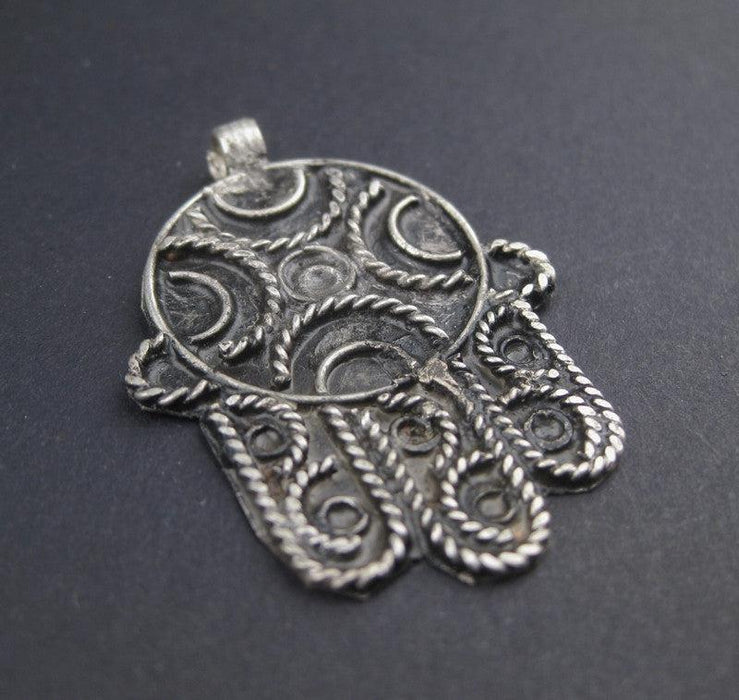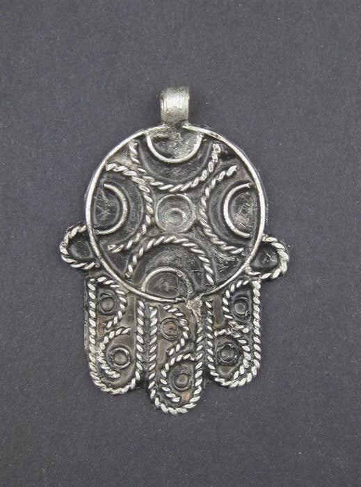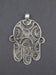 This artisanal silver-washed Hamsa pendant was made by a craftsperson in Morocco. The Hamsa is a traditional middle-eastern charm worn by people for protection from harm. This pendant measures 23mm wide x 42mm long.