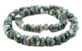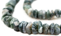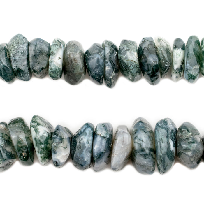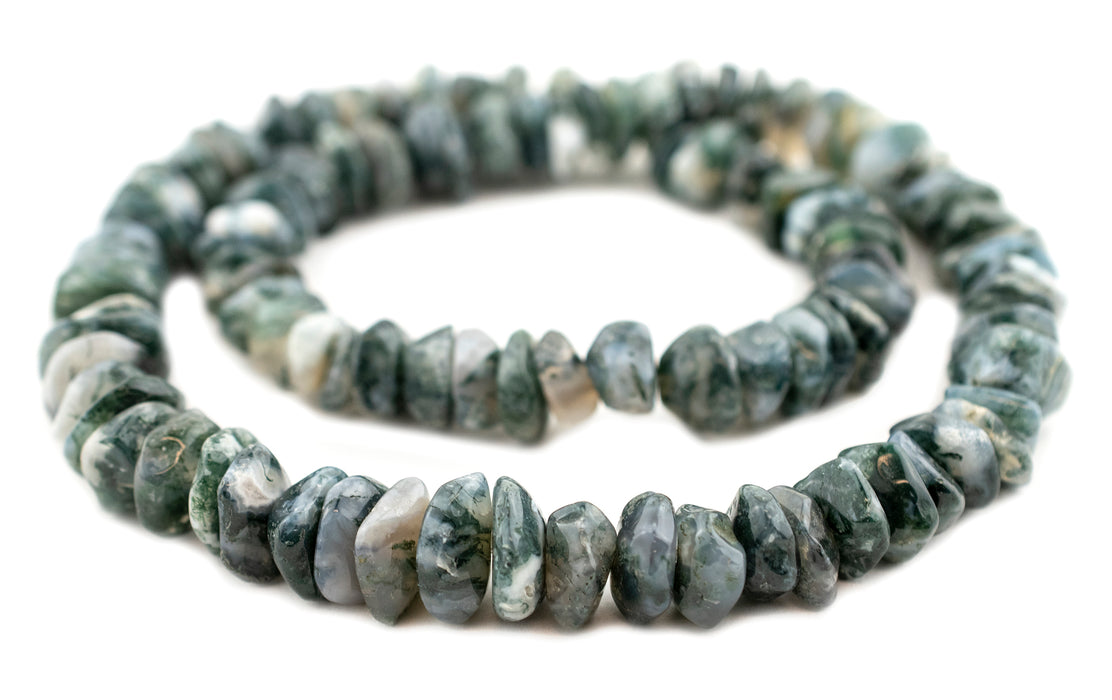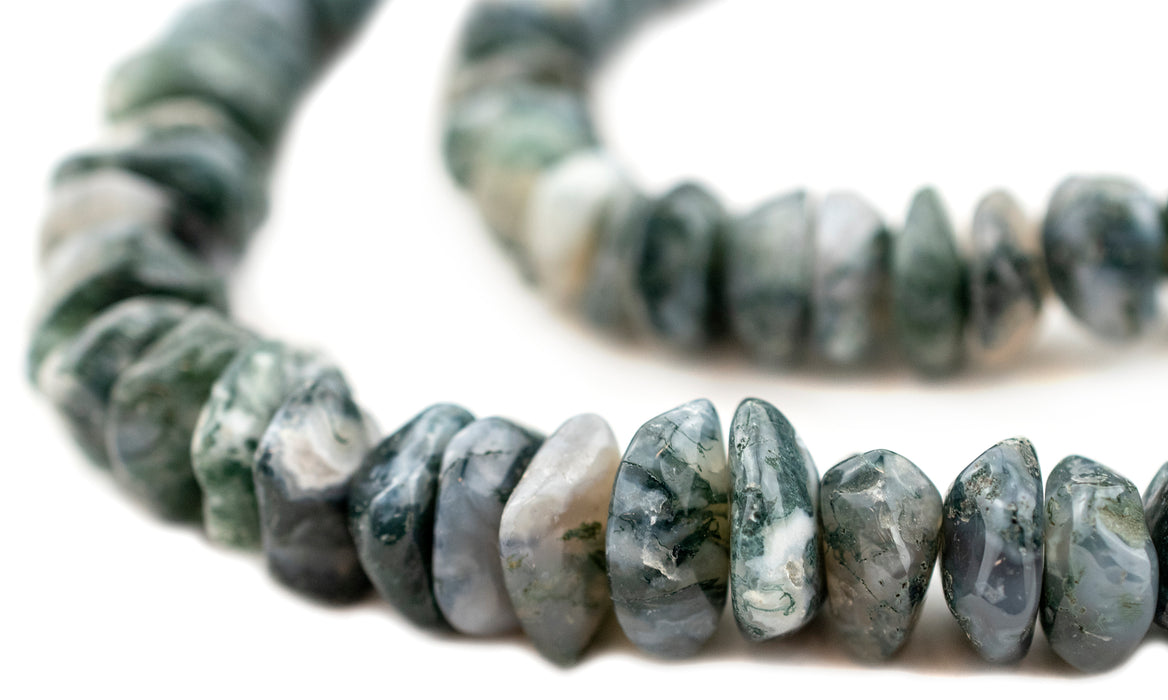 These beautiful Agate beads have an earthy green hue and striking crystalized appearance. Moss Agate is a semi-precious stone composed of quartz-opal and chalcedony minerals. Each individual stone bead has its own uniquely textured pattern. Ideal for jewelry designers looking to create an organic look. Each bead measures about 3-8 x 11-16mm with a hole size of approximately 1mm. You will receive a full strand measuring roughly 20”. Add a pop of earthy texture to your design kit today.