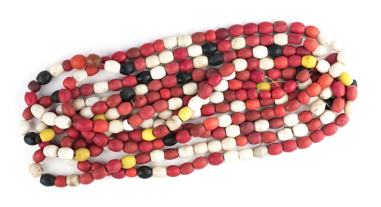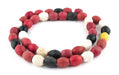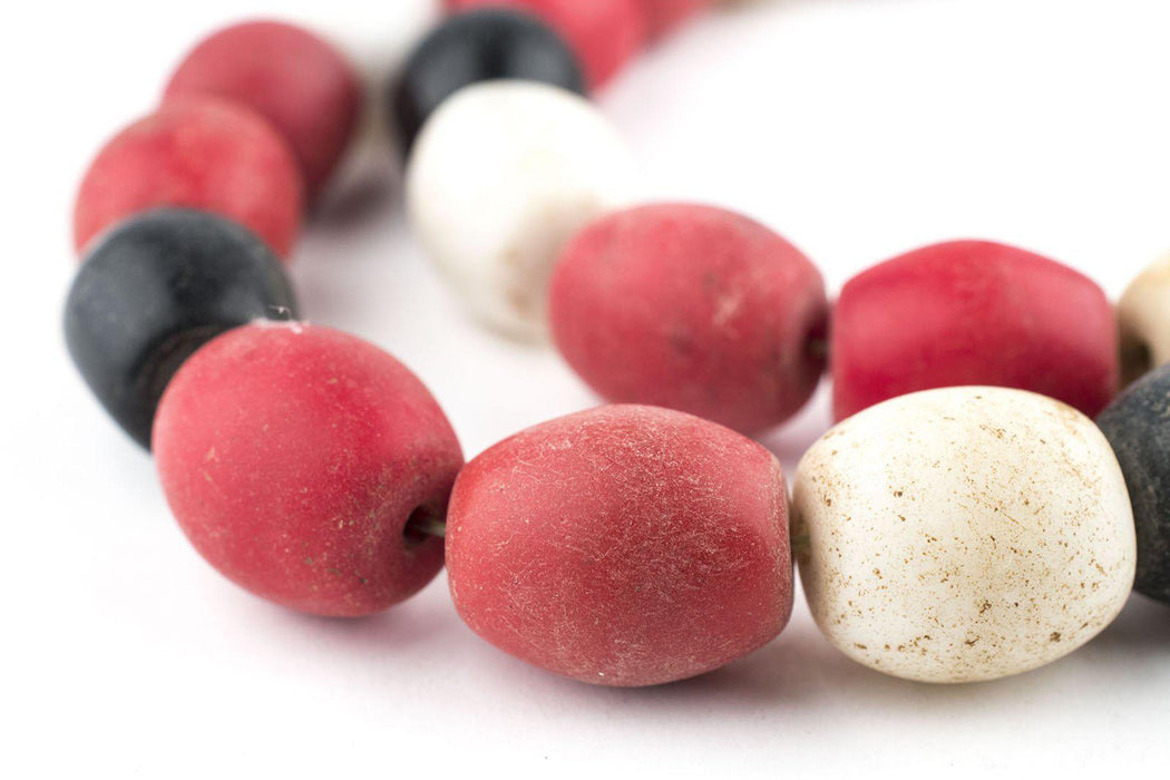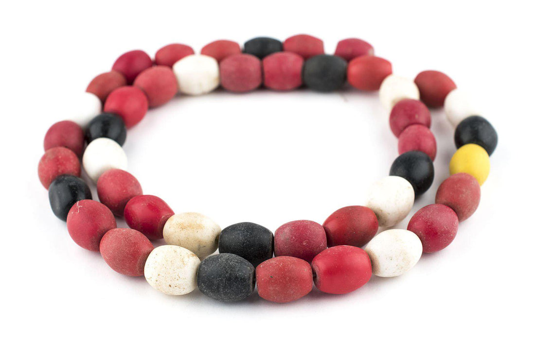 Colodonte is a type of bohemian glass. Each strand measures approximately 26" long, with individual beads measuring 14-16mm in length and 11-14mm in diameter. Colodonte beads are typically found in red, black, and white colors. The strand you receive will have a random combination of these colors. Some beads may be chipped due to age. Please inquire in advance if you specific needs. Multiple strands are pictured to show degree of variation. For each order you will receive a single randomly selected strand. Limited supply.