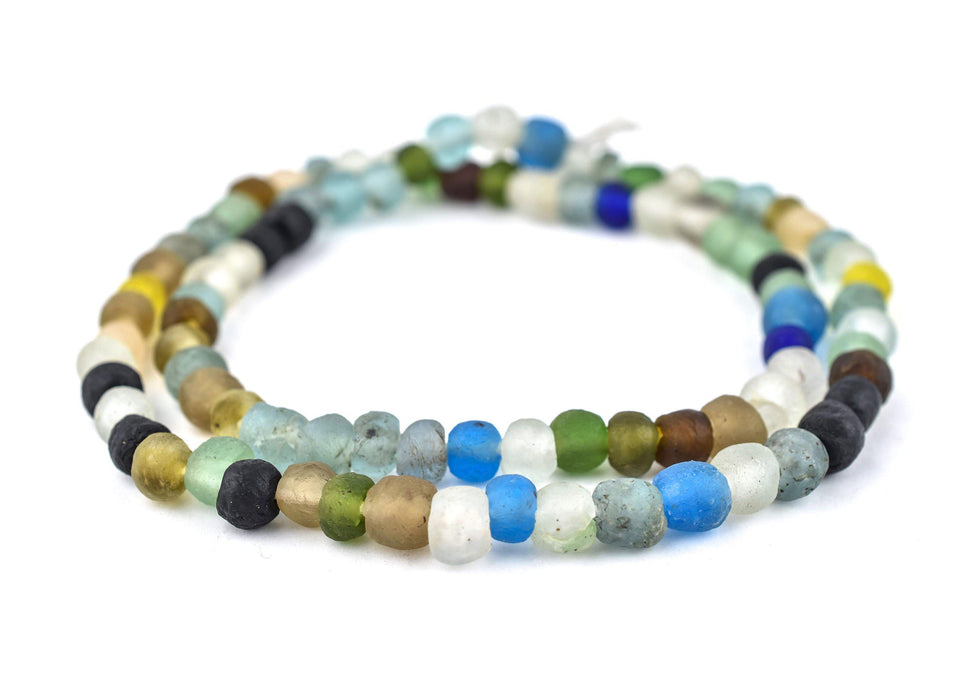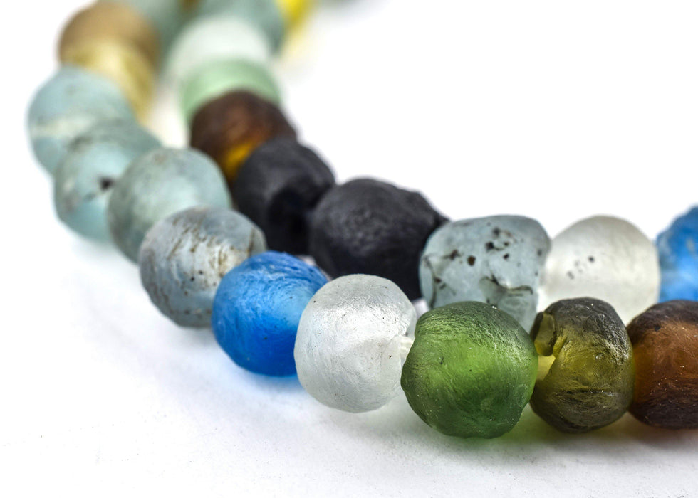 Recycled glass beads are a type of indigenously produced African bead from Ghana West Africa. These beautiful multicolor color recycled beads are made using an old method that has been used for centuries. The glass itself is derived from a variety of recycled sources including old beverage and medicine bottles. The procedure for making the beads consists of a number of steps whereby powdered glass is poured into molds of clay and baked in a specialized oven. These beads are produced in large part by the Krobo tribe and through recycling glass are environmentally friendly.