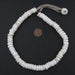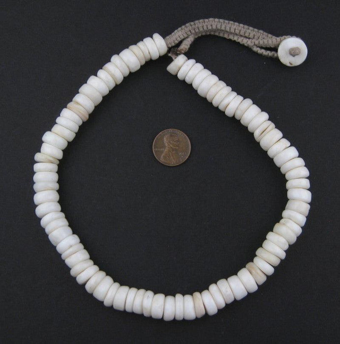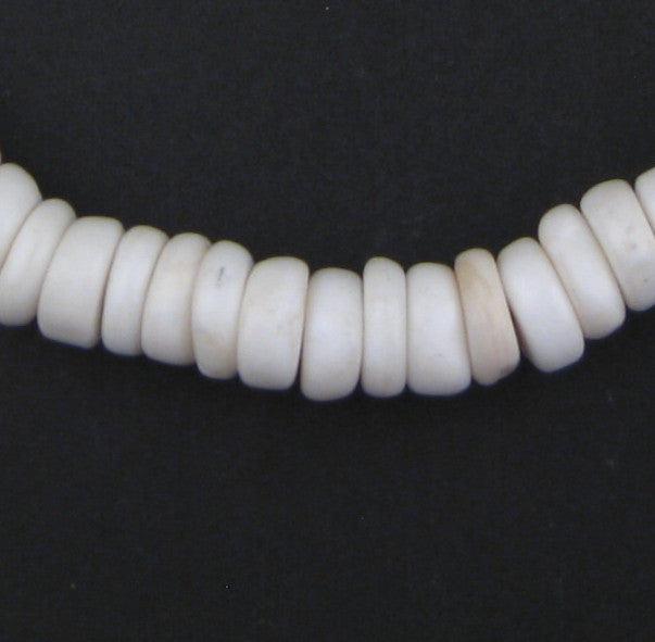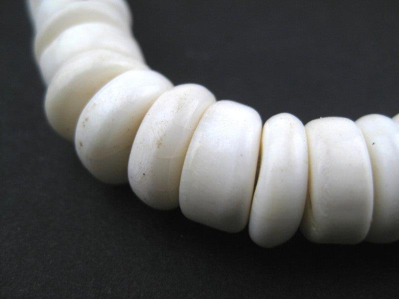 Admire the detail of these unusual beads fashioned in a disk-like shape from the natural shell of the ocean conch. The material for these unique beads is said to have been traded from the Bay of Bengel north towards the Himalayan mountains. No two beads are alike however beads measure approximately 3-5 x 12mm diameter with hole size of . The length of strand measures about 20â€. Each strand is unique and may vary slightly from photo. Beads may be used in your own special jewelry design however the beads have been nicely strung and the strand may also easily be worn as a necklace. Limited quantity available.