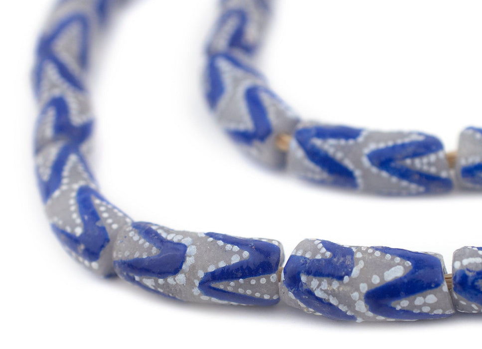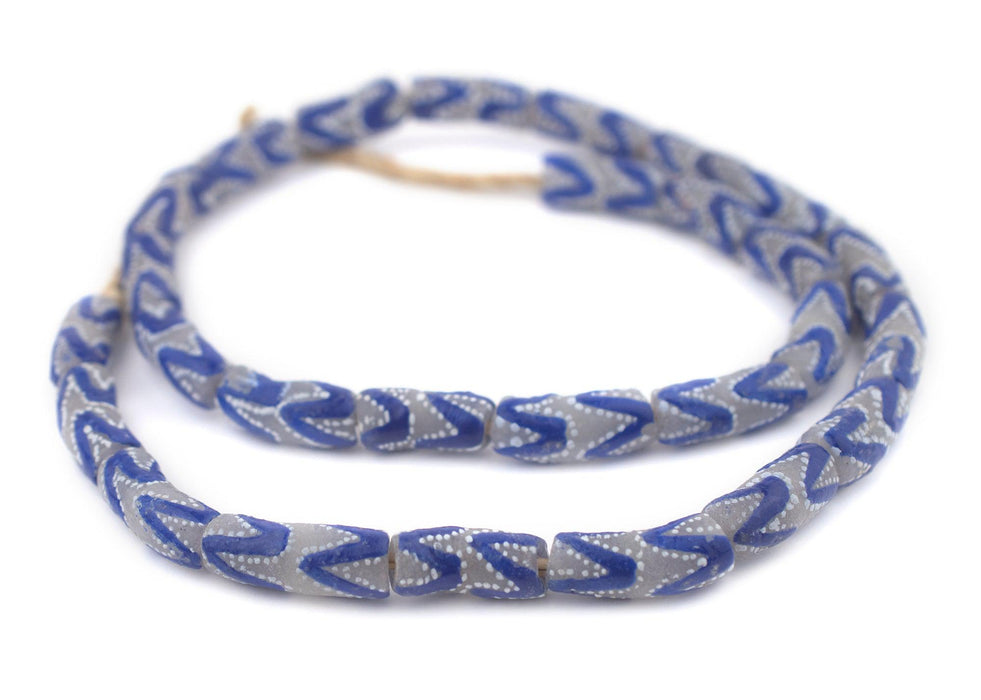 This beautiful strand of African powder glass beads was made by the people of Krobo Mountain in Ghana, West Africa. Many designs of Krobo beads are patterned to resemble old Venetian fancy trade beads. They are made from bottles and other glass items that are turned into powder, then poured into molds in order to create beads. Decorations on the beads are made with a paste made of colored glass powder and water which is applied by hand using a thin wooden stalk. The beads are cooked a second time to fix the decor. Each bead measures approximately 23-28 x 10-11mm with a hole size of approximately 3-4mm. You will receive a full strand measuring approximately 32". Limited supply.