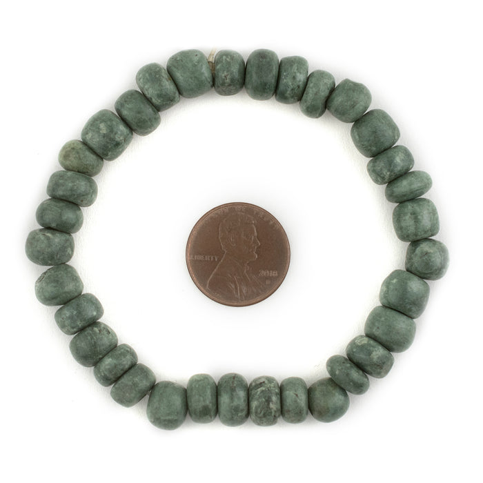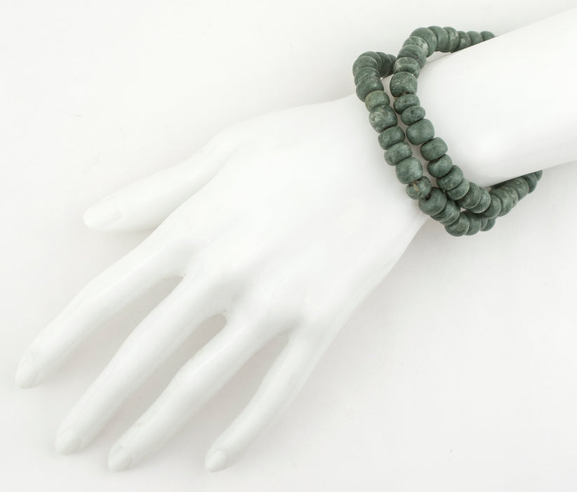 Made from authentic Guatemalita Jade stone, these unique beads have been individually shaped and polished by the native Mayan people of Guatemala in Central America. While these beads are newer production, the Mayan people have an ancient history of stone carving that stretches back over one millennium. Look carefully and you can see the natural quality and texture of the stone. The beads have been strung on a stretchy bracelet and may be worn "as-is" or re-purposed in your own unique designs. Exact length of beads may vary slightly due to variation in size. Hard to find!