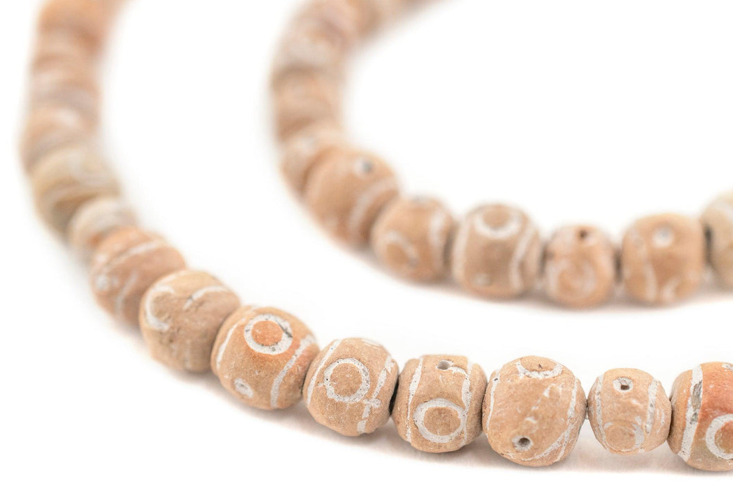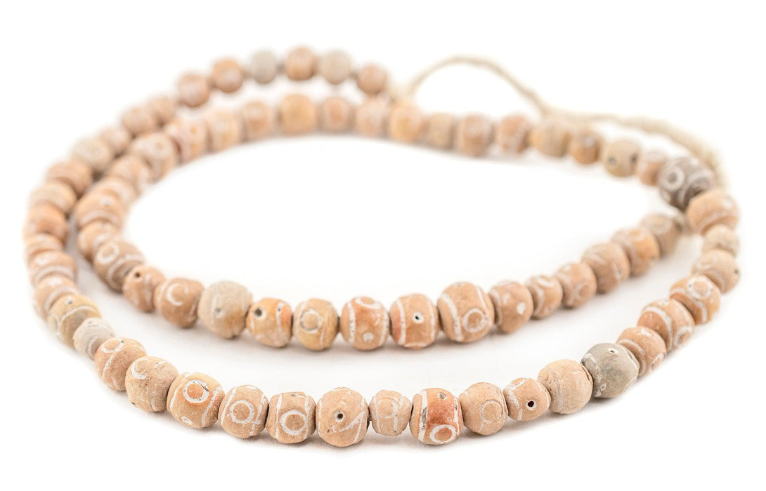 Take a look at this strand of these tan circle and dot patterned terracotta Mali clay beads. Beautifully hand crafted, each bead may show slight variation in size and pattern. Each bead measures approximately 9 x 9-10mm, with a hole size of approximately 2mm. You will receive one strand measuring approximately 25". There are around 70 beads on each strand. Take one home for yourself today.