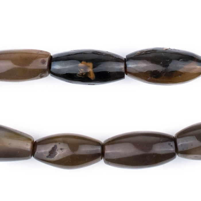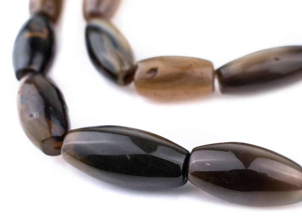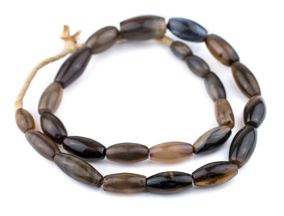 Admire these sleek black agate beads from Nigeria. Varied in shades of brown and grey, the smooth natural tones are sure to impress! Black stone beads such as these are harder to find than the more common reddish agates. Each unique strand contains approximately 25 beads with 2mm drill hole. Bead size may vary between 14-34mm wide and 10-14mm in diameter. Each strand is unique and may vary from picture with different beads strung to a length of 26". Beads are strung on a durable cord with raffia finishing. May be worn as is or use them in your own special designs!