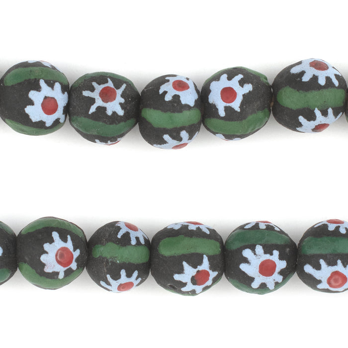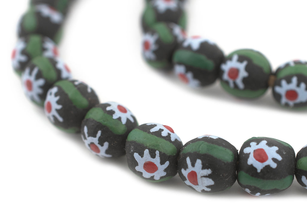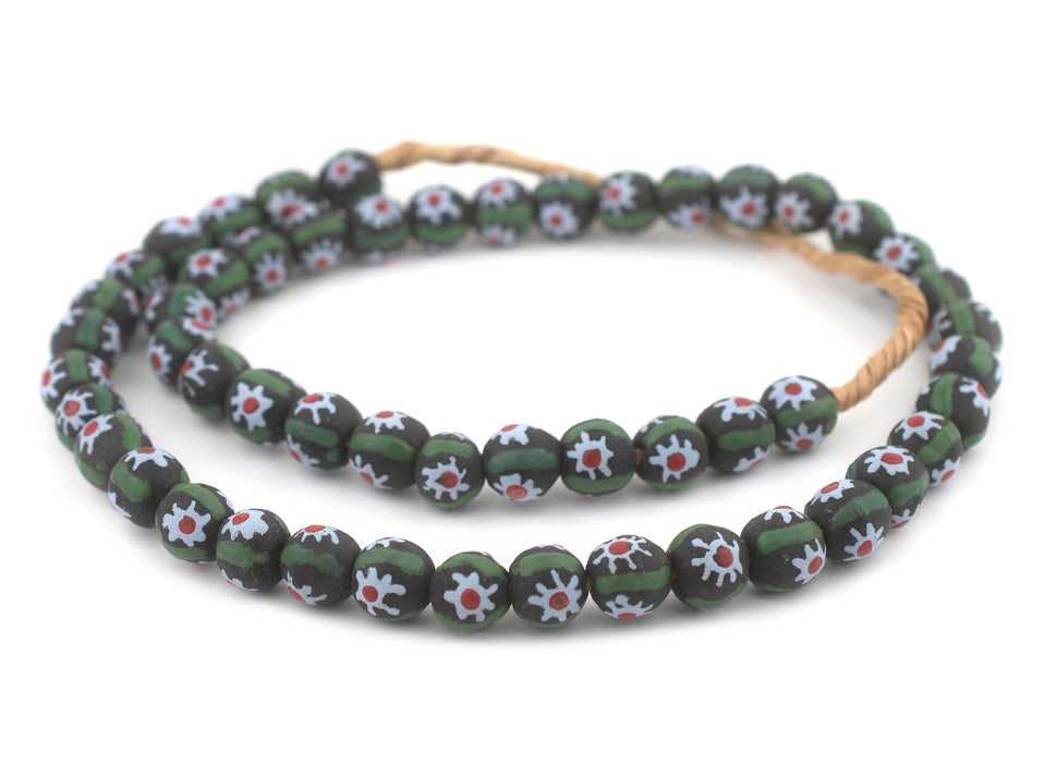 This beautiful strand of African powder glass beads was made by the people of Krobo Mountain in Ghana, West Africa. Many designs of Krobo beads are patterned to resemble old Venetian fancy trade beads. They are made from bottles and other glass items that are turned into powder, then poured into molds in order to create beads. Decorations on the beads are made with a paste made of colored glass powder and water which is applied by hand using a thin wooden stalk. The beads are cooked a second time to fix the decor. Each bead measures approximately 12-13 x 12-13mm with a hole size of approximately 2mm. You will receive a full strand measuring approximately 30". Limited supply.