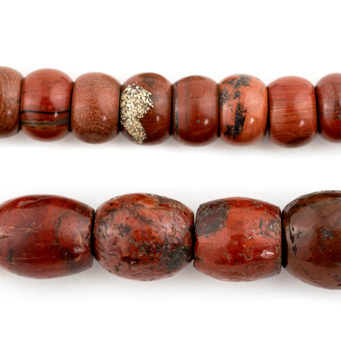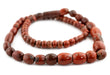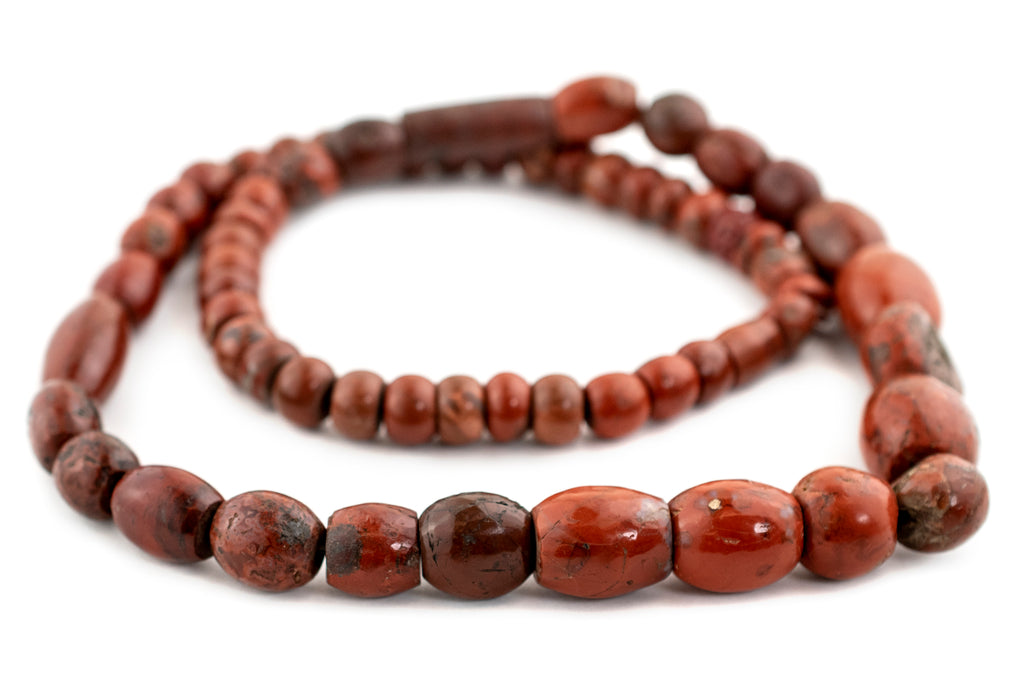 The rust red tones of these natural Jasper stone beads are rich and distinctive. Older Jasper beads such as these likely traveled across the trade routes of West Africa possibly from as far away as Southeast Asia. The varied shapes of these hand-polished beads gives each strand a unique and special look that sets them apart from newer productions. Individual beads will measure 5-33 x 6-24mm in diameter with hole size of approximately 2mm. The strand is graduated and measures approximately 26" in length. You will receive the exact strand pictured. Only one available.
