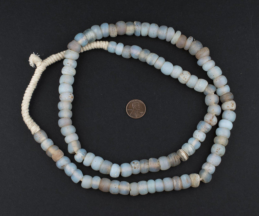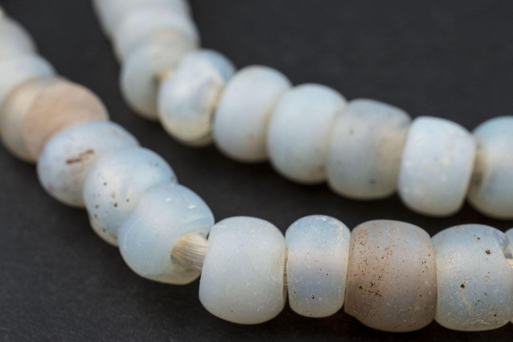 If you are looking for something special, this is it. These exceptionally rare Moon Beads are very hard to find and are known for their unusual opalescence. Dutch and Venetian traders once used these beads to trade with the people of Ethiopia and East Africa. Today, Moon Beads are prized by history aficionados and coveted by collectors of old beads alike. Their exact age is unknown but it is believed that they may be as much as several hundred years old. Beads, as pictured, will show some signs of age. Current stock is slightly shorter than pictured and strung on raffia straw.