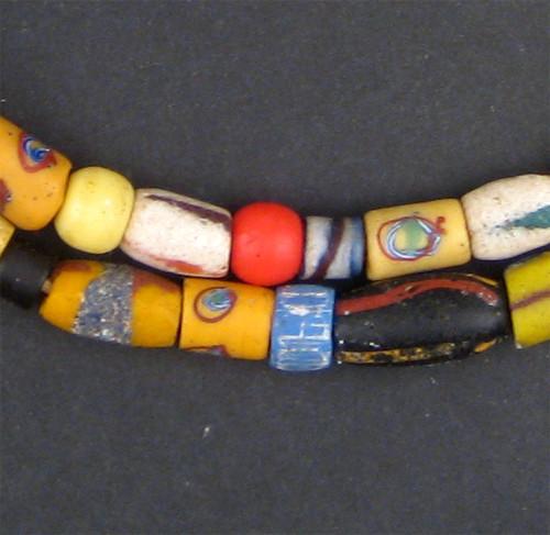 These mixed African trade beads are a great buy for those looking to get into African trade beads. Each strand is unique, so you will receive the exact strand pictured. Take a look around as we have multiple strands available. Strands can often include chevron beads, Millefiori beads, wound beads, green hearts, russian blues, end of day beads and many others.