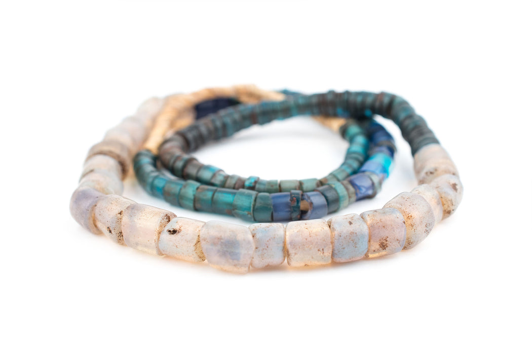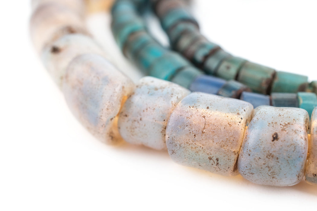 These glass beads are a rare and brilliant shade of aqua blue and white. The white-colored beads resemble moon beads found in East and West Africa however this shape is unusual and uncommonly seen. Likely of European provenance, these old beads have graced many owners and show the travails of time. The strand measures 29" in length with individual beads 1-10 x 5-10mm. You will receive the exact strand pictured. Only one available.