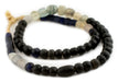 This beautiful strand of old glass trade beads is comprised of several unique varieties. The large black beads are likely of European provenance and are sometimes referred to as Opate beads by African Traders. Other beads represented on this strand include Faceted Russian Blue Beads and clear Dogon Beads. This is a long strand measuring nearly 40" in length with individual beads measuring approximately 11-27 x 13-21mm. The beads have a large hole measuring 5-7mm and have been nicely strung on traditional raffia. Only one strand available!
