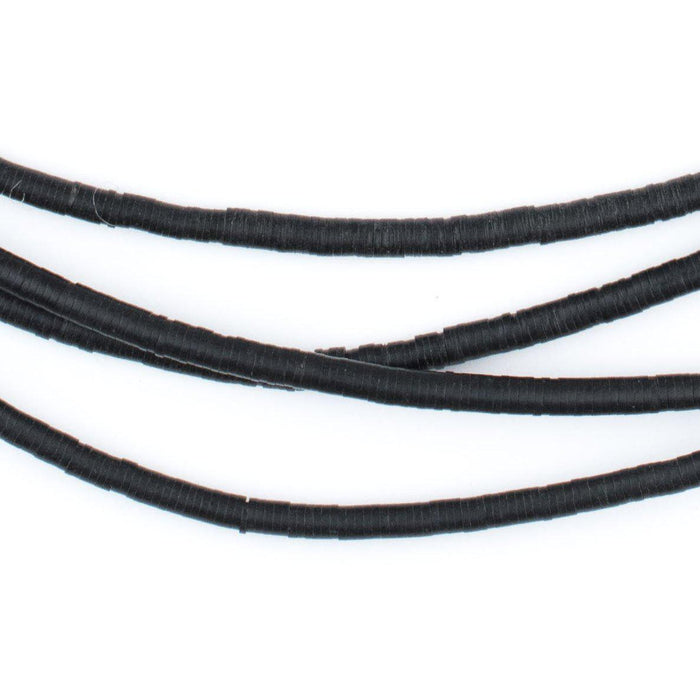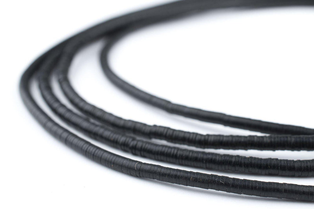 Take a look at this beautiful strand of African vinyl beads black color. Beads such as these are found in Ghana and Nigeria where they are sometimes worn as waist beads. These beads are said to be made from recycled phonograph records. This strand measures approximately 30" long with individual beads measuring 1 x 2.5-3mm. These beads are light and fun to wear and also versatile for jewelry designs. Each strand is sold individually. Multiple strands pictured. Each strand sold individually.