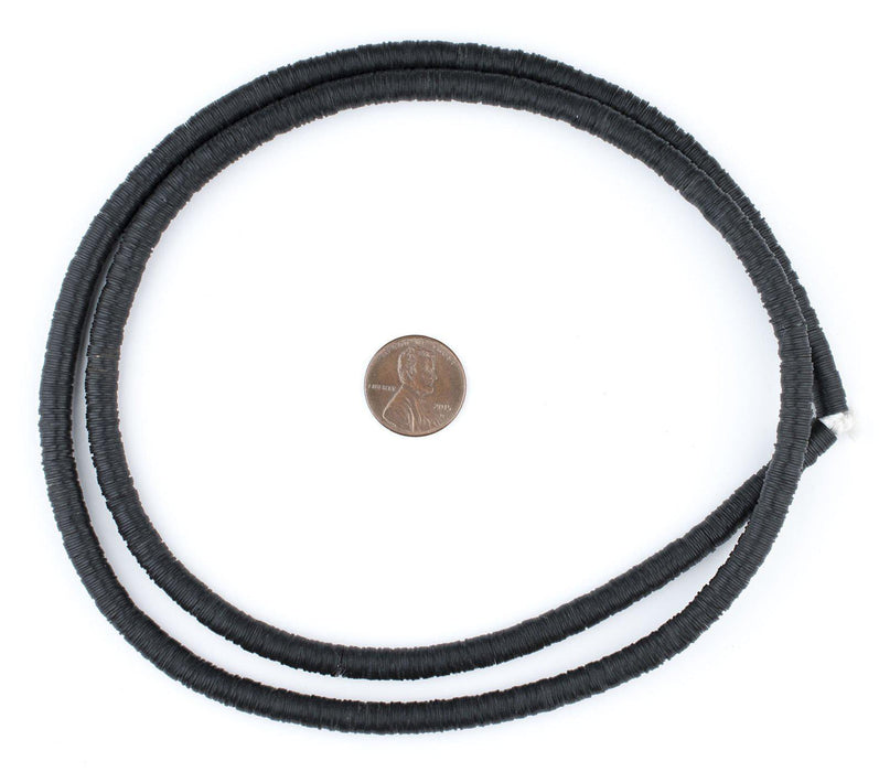 Take a look at this beautiful strand of African vinyl beads in a black color. Beads such as these are found in Ghana and Nigeria where they are sometimes worn as waist beads. Older versions such as these are said to be made from the same material as phonograph records. This strand measures approximately 30" long with individual beads measuring 1 x 6mm. These beads are light and fun to wear and also versatile for jewelry designs. Some strands may have a small percentage of other color beads. Each strand is sold individually.