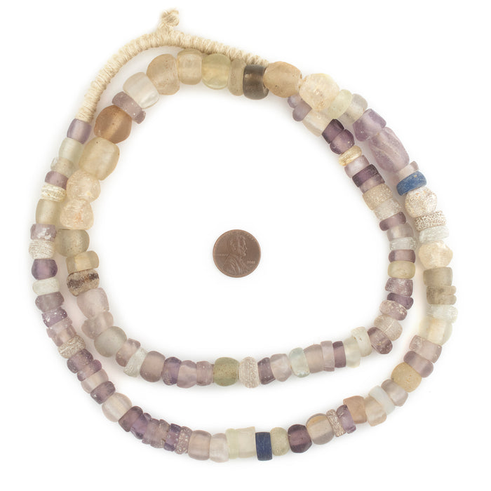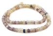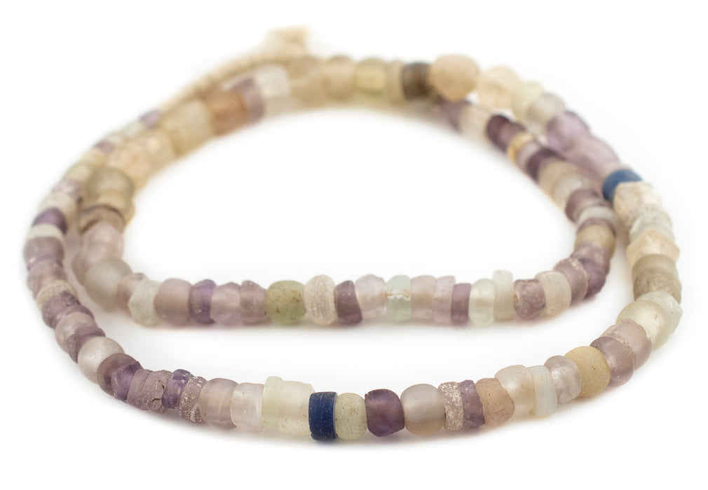 These old beads, commonly referred to by traders as 'Television Beads' are a rare variety of Dogon bead that is differentiated by its slightly more irregular shape. The Dogon people are an ethnic tribe that inhabits a swathe of West Africa. They are known for their strong artistic tradition including wood-carvings and are also associated with a number of bead varieties. Possibly of Dutch provenance, this specific strand is unique due to the number of lavender colored beads. Individual beads measure 4-15 x 8-16mm diameter on a 34" strand. You will receive the exact strand pictured. Only one available.