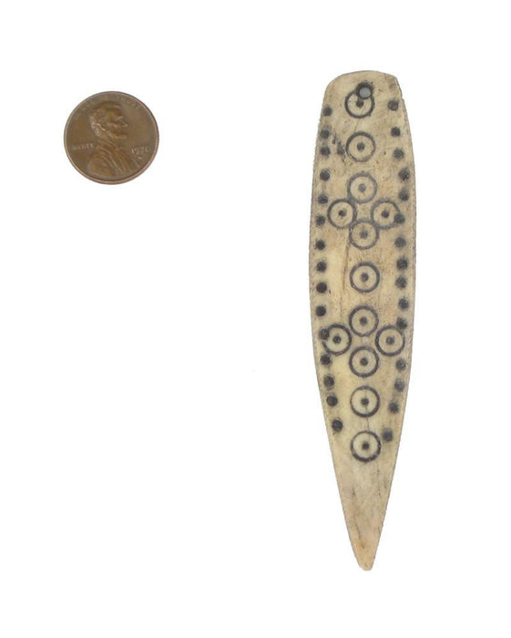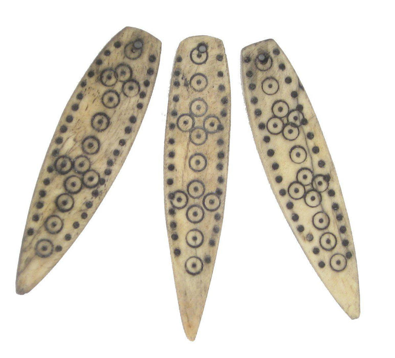 This unique hand-carved shaman medicine stick from Ethiopia is made from camel bone. The medicine stick is intended as protection from the evil eye and is used by the shaman for prophecy and healing. Each medicine stick is a little bit different and measures approximately 90-120mm in length. Pendant's pattern and color may vary slightly from photo. Several representative pendants are shown in photo. Each medicine stick is sold individually.