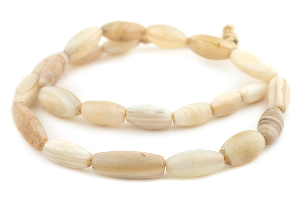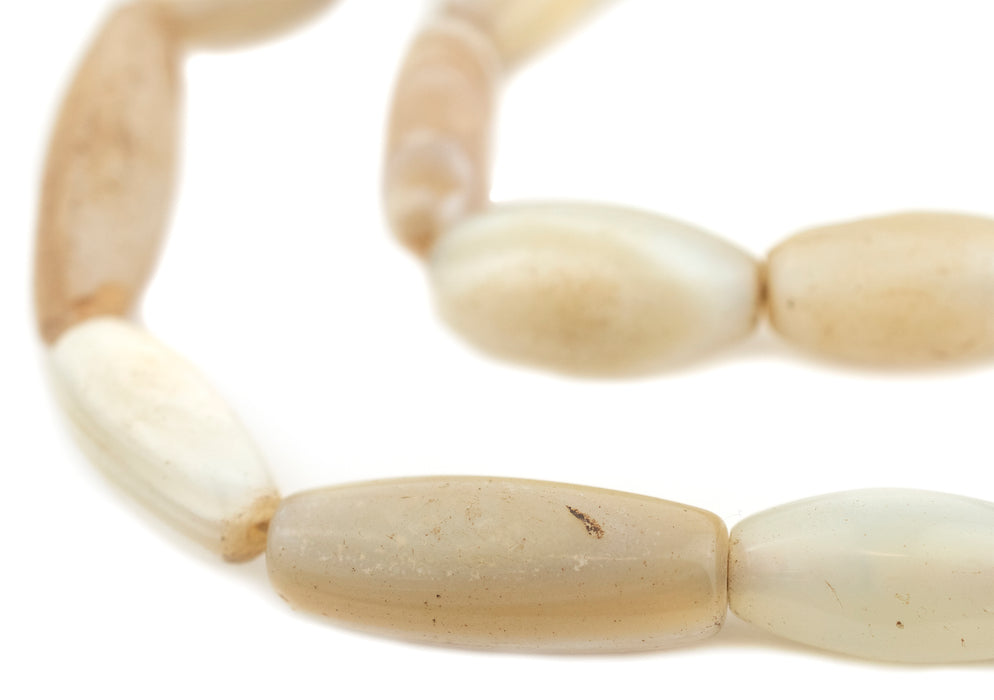These old natural stone beads are found in Nigeria. Populating a wide swath of West Africa, the people of the Fulani tribe have long put high value on the decorative arts. Although the exact provenance of these beads is unknown it's possible that that they may have originated in Southeast Asia and been subsequently traded to the African Continent. Strung on a durable cord and nicely finished with raffia, each bead is unique and will have it's own special pattern and texture. These beads are a harder to find smaller size measuring approximately 24-38 x 11-15mm. Some beads may show signs of age. Good for jewelry-making, home decor, or even may be worn as a necklace. Each strand is unique and may vary slightly from strand pictured.