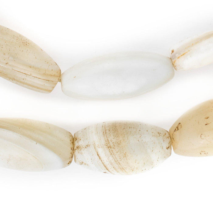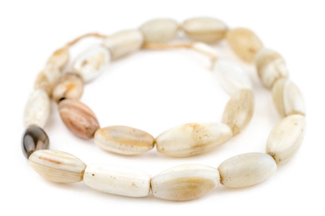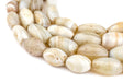These old natural stone beads are found in Nigeria. Populating a wide swath of West Africa, the people of the Fulani tribe have long put high value on the decorative arts. Although the exact provenance of these beads is unknown it's possible that that they may have originated in Southeast Asia and been subsequently traded to the African Continent. Strung on a durable cord and nicely finished with raffia, each bead is unique and will have it's own special pattern and texture. These beads are a harder to find smaller size measuring approximately 9-17mm. Some beads may show signs of age. Good for jewelry-making, home decor, or even may be worn as a necklace. You will receive the exact strand pictured.