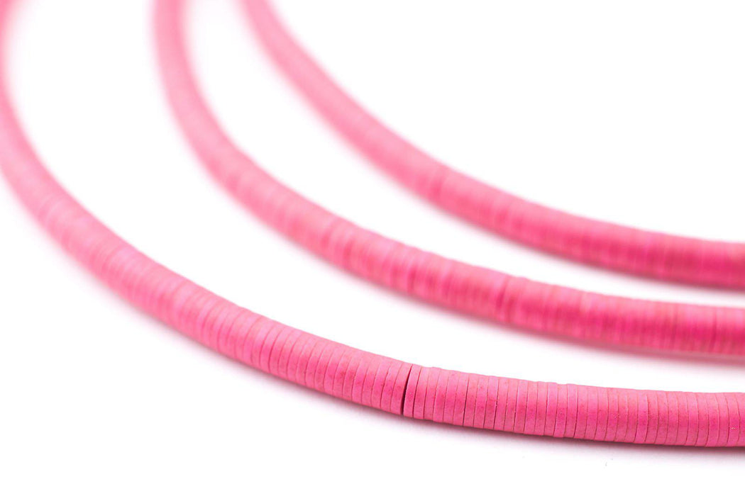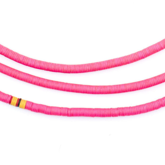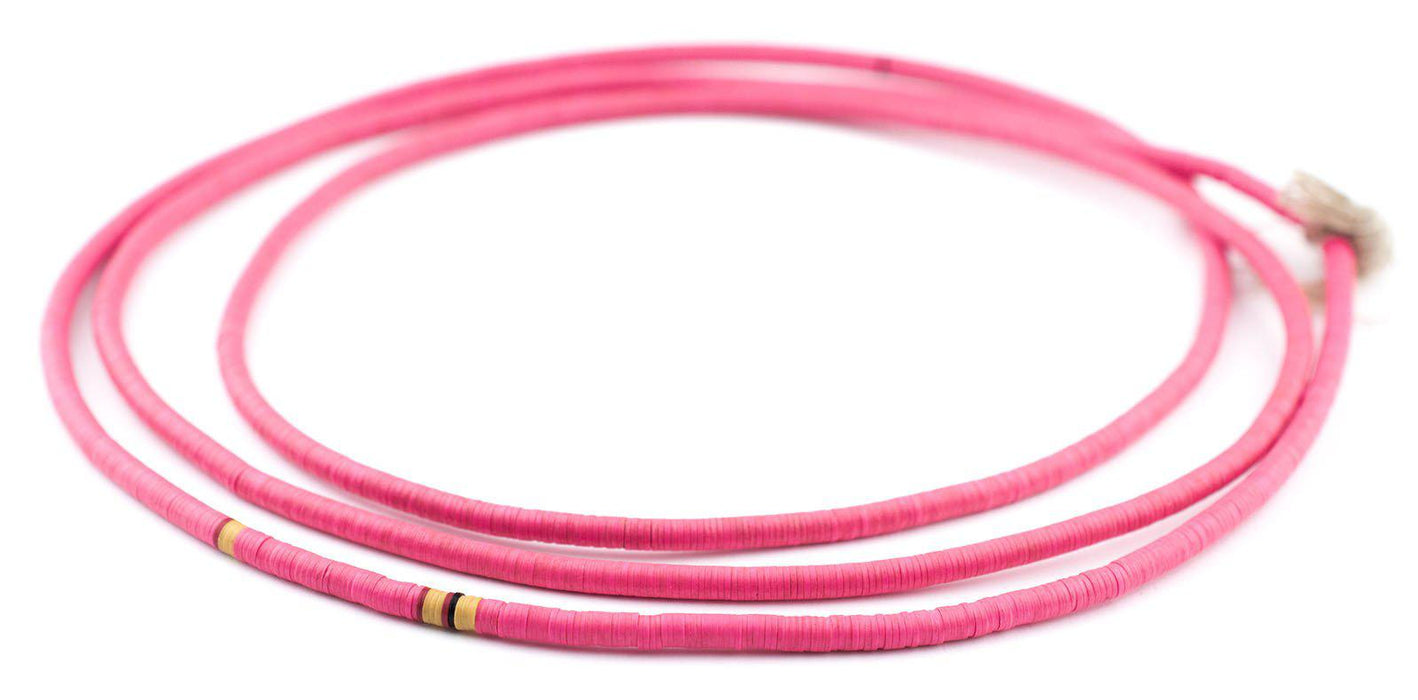 Take a look at this beautiful strand of African vinyl beads pink color. Beads such as these are found in Ghana and Nigeria where they are sometimes worn as waist beads. These beads are said to be made from recycled phonograph records. This strand measures approximately 39" long with individual beads measuring 1 x 3mm. These beads are light and fun to wear and also versatile for jewelry designs. Each strand is sold individually. Multiple strands pictured. Each strand sold individually.