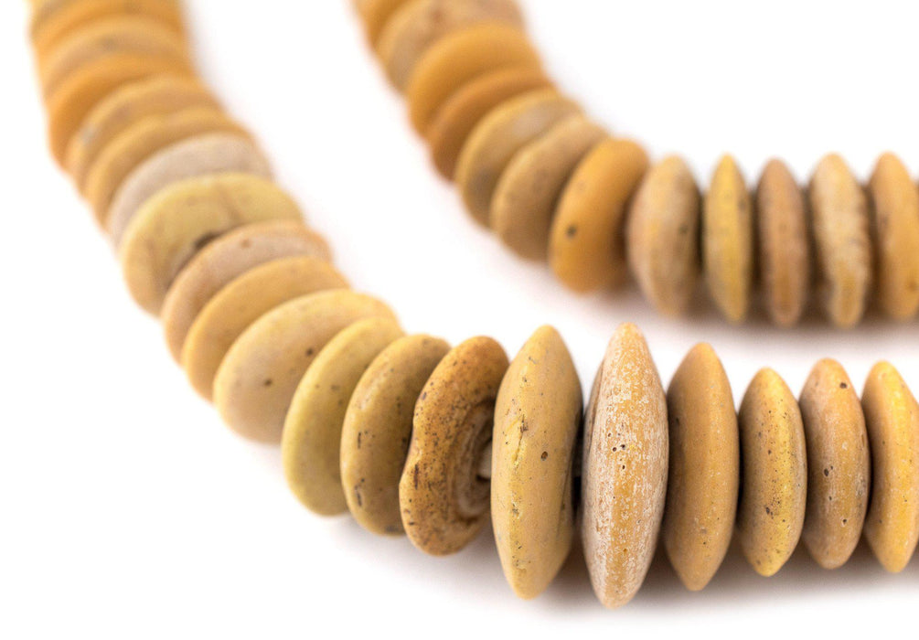 These antique glass beads from Togo are likely Venetian production from the 19th century. The pits and imperfections of the mustard matte finish shows the trials and travails of time. Old glass beads such as these are increasingly hard to find. The beads are together on a long 36" strand with individuals beads varying size between 4-6mm wide and 12-21mm. Each strand is unique and may vary slightly from picture. Limited supply.
