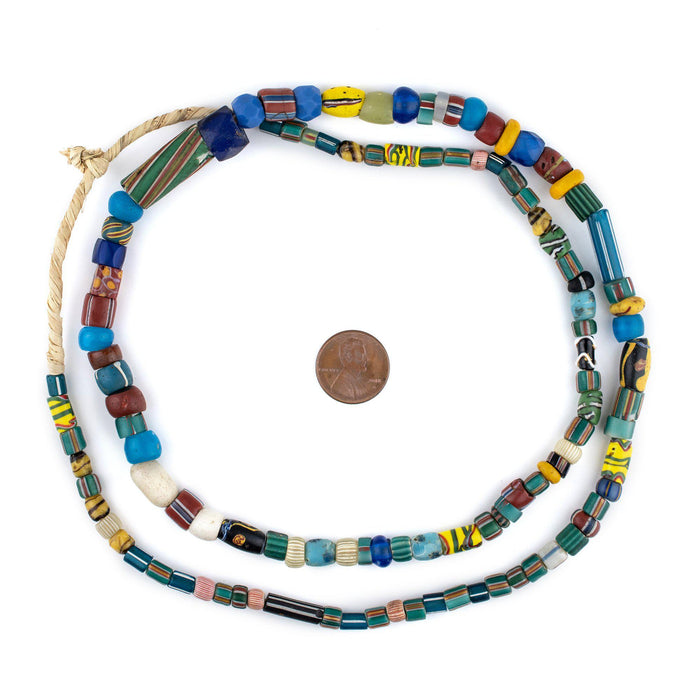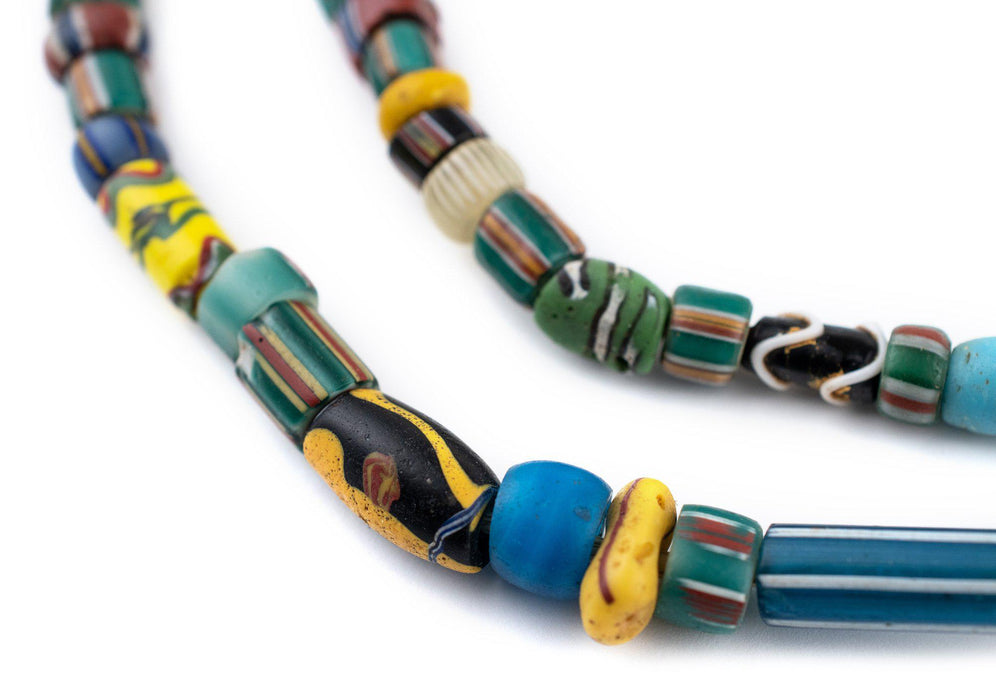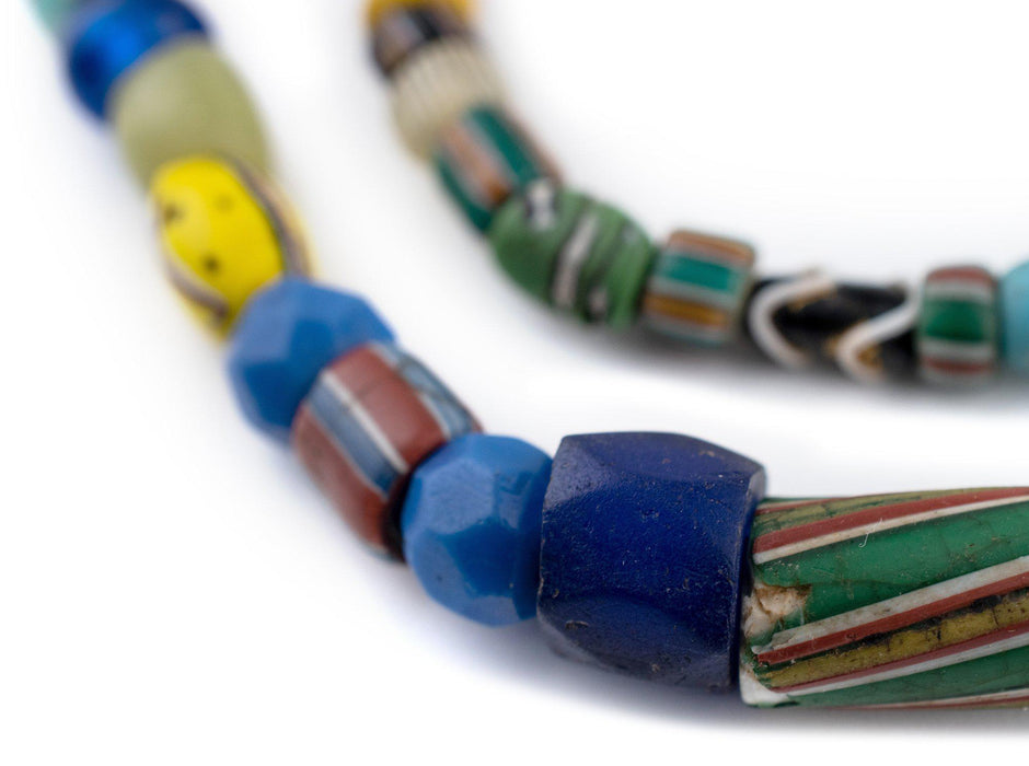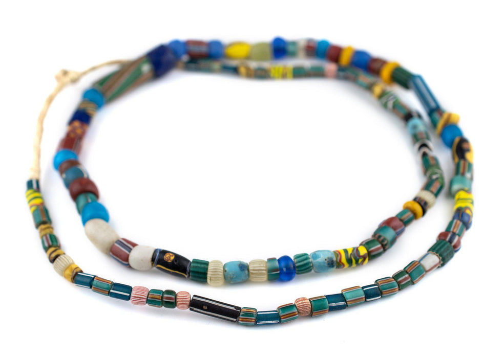 This beautiful strand of authentic old Trade Beads is composed of a number of different unique varieties of colors and shapes. Among those beads represented are Cylindrical Watermelon Chevrons, red and white gooseberry beads, several Fancy Beads, Bohemian Russian Blue Beads, and others. This long strand measures approximately 31" in length with beads nicely arranged in a graduated fashion. Individual beads range in size between 3-15mm wide and 5-12mm in diameter. Some beads may show chips or other signs of wear due to age. Only one unique strand available. What you see is what you get!