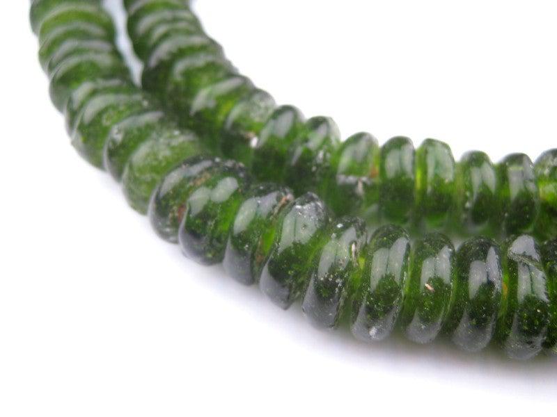 Take a look at these beautiful rondelle shaped recycled glass beads. Powder glass beads are made by crushing glass to a fine powder and heating it so that the particles fuse together. The glass is then poured into clay molds, with a cassava leaf stem used to make the hole. They are baked in an oven and the glass fuses and the cassava stem burns up. This technique has been used in Africa for centuries.