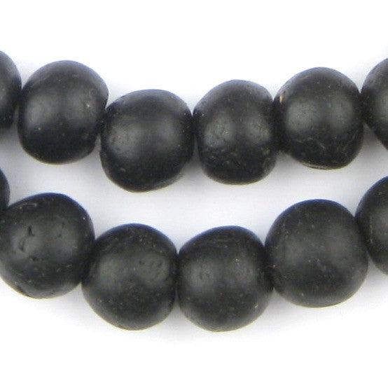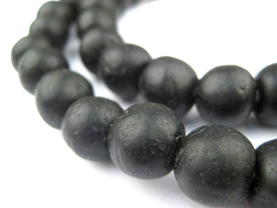 Recycled glass beads are a type of indigenously produced African bead from Ghana West Africa. These beautiful black color recycled beads are made using an old method that has been used for centuries. The glass itself is derived from a variety of recycled sources including old beverage and medicine bottles. The procedure for making the beads consists of a number of steps whereby powdered glass is poured into molds of clay and baked in a specialized oven. These beads are produced in large part by the Krobo tribe and through recycling glass are environmentally friendly.
