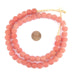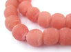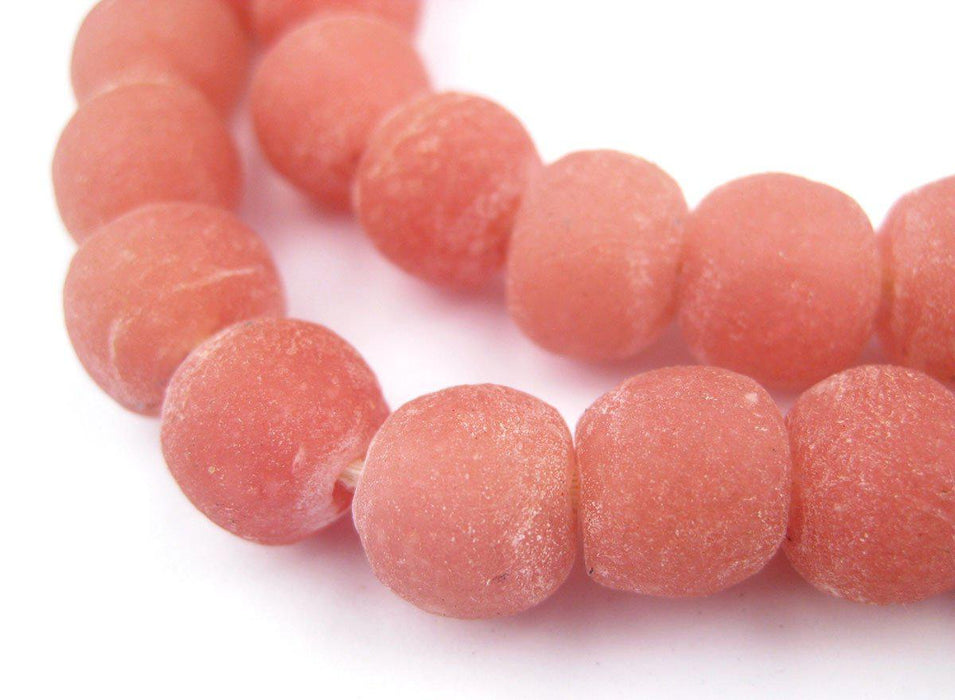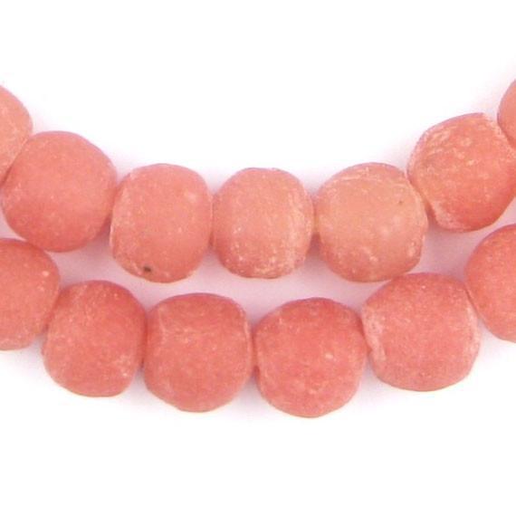 Recycled glass beads are a type of indigenously produced African bead from Ghana West Africa. These beautiful pink color recycled beads are made using an old method that has been used for centuries. The glass itself is derived from a variety of recycled sources including old beverage and medicine bottles. The procedure for making the beads consists of a number of steps whereby powdered glass is poured into molds of clay and baked in a specialized oven. These beads are produced in large part by the Krobo tribe and through recycling glass are environmentally friendly. Shade of pink may vary slightly from photo.