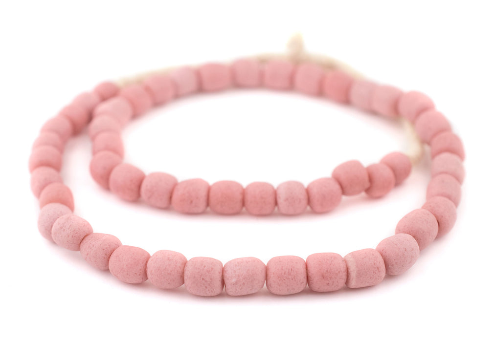 These beautiful recycled glass beads are handmade by artisans in the West African country of Ghana. Each bead is individually handcrafted through a traditional process passed down generation to generation. The steps involve crushing glass into tiny pieces, placing it in a mold, and then heating the crushed glass at high temperatures in a clay oven. Different types of glass are used including old cola bottles, broken tiles and windows, and other types of repurposed glass. The beads on this strand measure approximately 12-13 x 13mm with a hole size of approximately 2mm. Each strand measures about 28" long. Shade of pink may vary slightly from photo. Get your strand today!