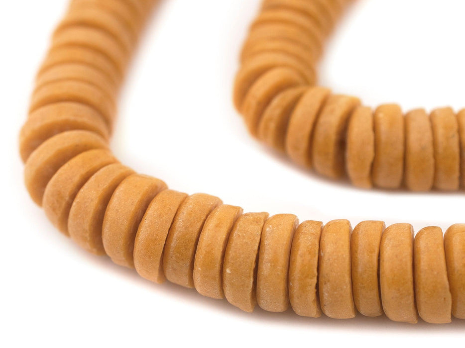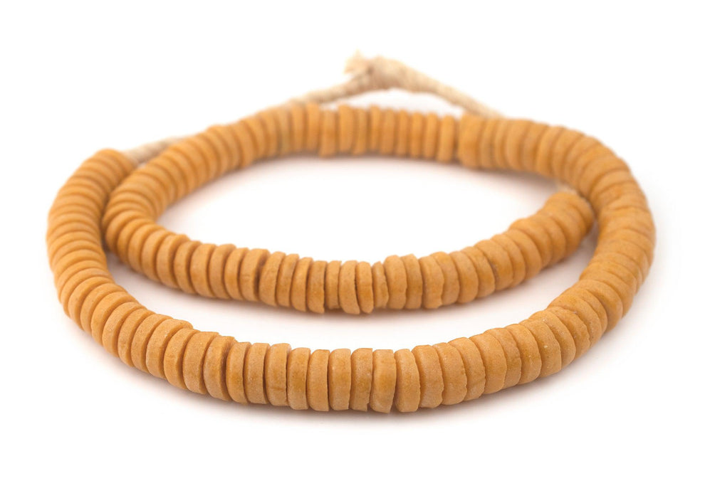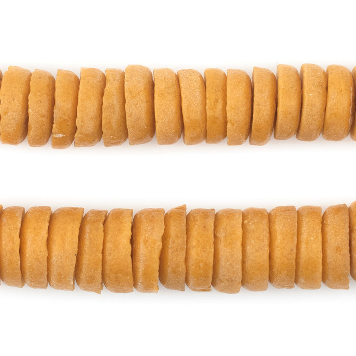 Checkout this beautiful strand of Ashanti glass saucer beads. The process of making these beads is unique to Africa and has been used for over 1000 years. Pulverized glass of various colors is poured into a clay mold, using a cassava stem for the bead's hole. The mold is placed in a furnace and heated until the glass particles congeal without actually melting and the stem burns out. The Ghanaians have been making beads in this manner since the 1600s. Each bead measures approximately 3-4 x 14mm with a hole size of approximately 3mm. You will receive a full strand measuring approximately 28". Available in many colors.
