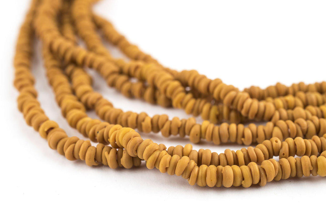 These light orange java glass heishi beads are handmade by independent artisans on the island of Java. Pay close attention and you will notice a very special heishi shape, coupled with a beautiful texture. These beads are perfect to use as in your ethnic jewelry designs. These beads measure approximately 1 x 3-4mm, with a hole size of 1mm. Each strand measures approximately 23 inches in length. Multiple strands pictured. Each strand sold individually. Shade of orange may vary slightly from strand to strand. Great quality at a wholesale value!