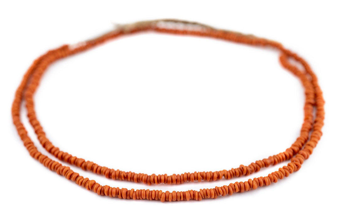 These orange java glass heishi beads are handmade by independent artisans on the island of Java. Note the special heishi shape that resembles a tiny ring and also the beautiful texture. These beads are perfect to use as in your ethnic jewelry designs. These beads measure approximately 1 x 3-4mm, with a hole size of 1mm. Each strand measures approximately 26 inches in length. Multiple strands pictured. Each strand sold individually. Shade of orange may vary slightly from strand to strand. Great quality at a wholesale value!