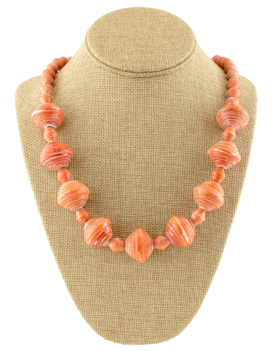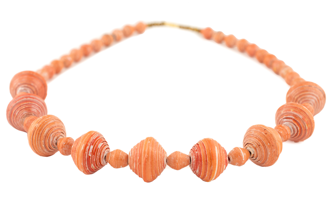 Beautiful strand of larger size orange recycled paper beads. These beads are made using recycled paper by working mothers in Uganda. Each bead is fair trade and handmade with love. Individual beads measure approximately 19x22mm for larger size beads and 12x10mm for smaller size beads with about 40 beads on each strand. Some beads may show slight sign of use, as they have passed through hands at African markets.