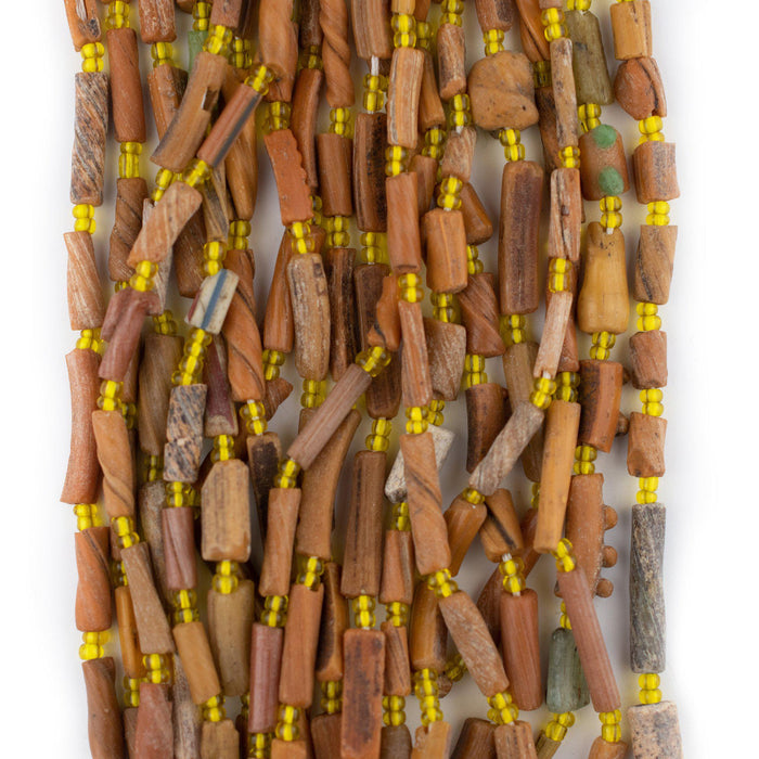 Take a moment to appreciate the true artistry of these Afghani Glass Beads. These alluring beads are said to be very old and are made by using pieces of antique Afghani Bangles, also sometimes identified as Roman Glass. Each bead has its own unique story to tell. These beads have a striking weathered look to them and can make for a great accent piece in your original jewelry designs. These glass bead strands even look great when worn as a simple necklace. Each bead strand is about 16" in length. Each individual bead is approximately 8-21 x 2-7mm and roughly has a 2mm bead stringing hole. Multiple strands pictured. Each strand sold individually. Each strand is unique and bead tones and shapes vary from strand to strand. Grab a strand for yourself and take a piece of history home today. Note that while the material is said to be of old, possibly ancient origin, the precise age of the glass has not been independently verified.