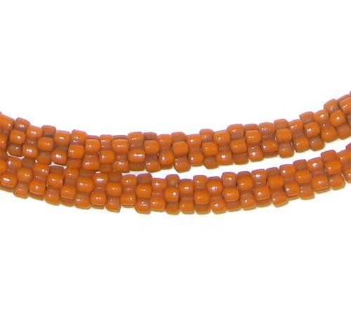 This strand of interlocking Czech glass beads is called "SNAKE" trade beads because of its similarity to the snake vertebrae. They date back from the early 1900's. These beads have been molded and the strand is in pretty good condition. This orange color strand would be great to be used as spacers. The beads are about 5mm in diameter by 2mm in width, and tones may vary slightly with a few beads of other colors possibly interspersed. This 'star' variety of snake beads is rare and much more difficult to find.