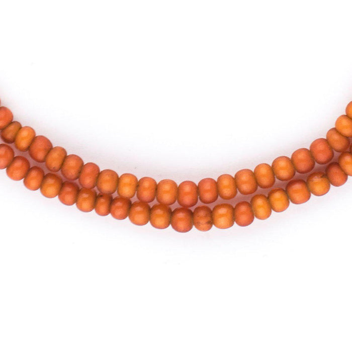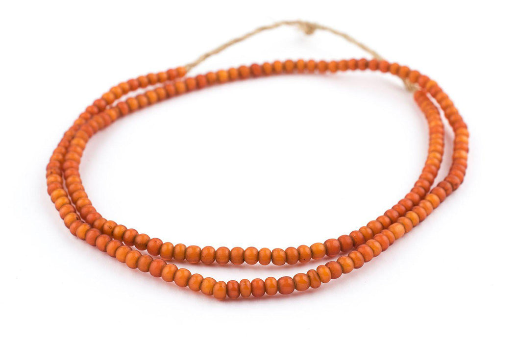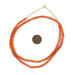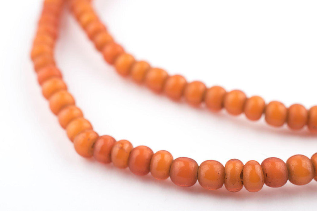 Check out this beautiful strand of orange color white heart beads from the Ivory Coast! White hearts derive their name from the inner core of opaque white glass that is coated with a layer of translucent colored glass. This process produces beads with a unique character as light passes through the bead. Beads such as these are originally of French or Czech provenance and traded in Africa. This strand measures approximately 25" long, with individual beads measuring about 4mm wide and 4-5mm diameter. Shade of orange may vary slightly from photo.