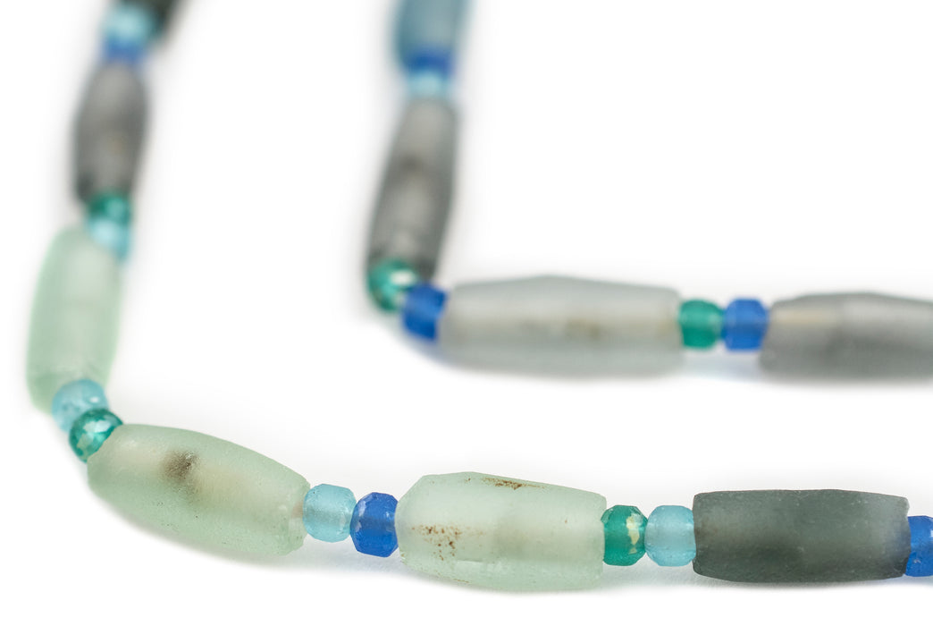 Admire this unique strand of beads made from ancient glass pieces found in the region along the historic silk road. Commonly referred to as Roman Glass, the material for these beads is derived from ancient cups, vases, and perfume containers that have sustained the travails of time. The glass pieces have been carefully cut, drilled, and strung together but you can see still the variation in color of the ancient glass. No two strands are alike but you will receive a strand similar to that pictured. Some strands may include tiny saucer-shaped spacers. These little beads are highly versatile and can be used as both spacers and accent beads. Truly something special to use in any jewelry design. Multiple strands pictured. Each strand is sold individually. You will receive a 13" strand. Note that while the material is said to be of old, possibly ancient origin, the precise age of the glass has not been independently verified.