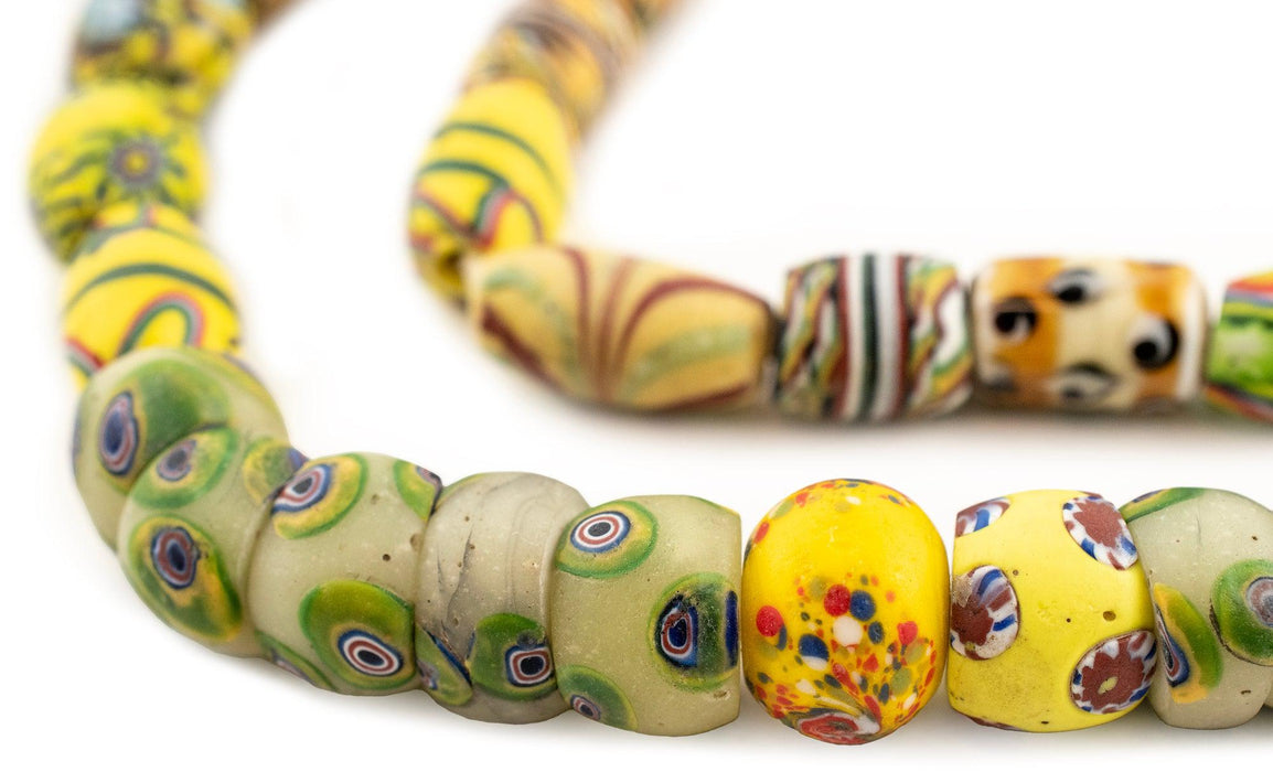 WOW! Take a look at this beautiful antique strand of Venetian Millefiori trade beads! Celebrated among the most distinctive of beads, the Millefiori has become nearly synonymous with the West African Trade. Made from famed Murano glass, Millefiori beads derive their name from the Italian words for “Thousand Flowers” due to the characteristic floral motifs that decorate their surface. Millefiori beads were made throughout the 19th and 20th century primarily for export to Africa. Today they are found in many countries including Ivory Coast, Nigeria, and Ghana where they are also known by their Ashanti name “Chachasao”.